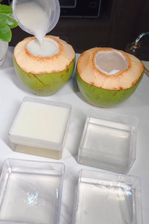 Tip nhỏ: Nên chọn nước dừa xiêm tươi để thạch có vị ngọt thanh tự nhiên và trong đẹp hơn.