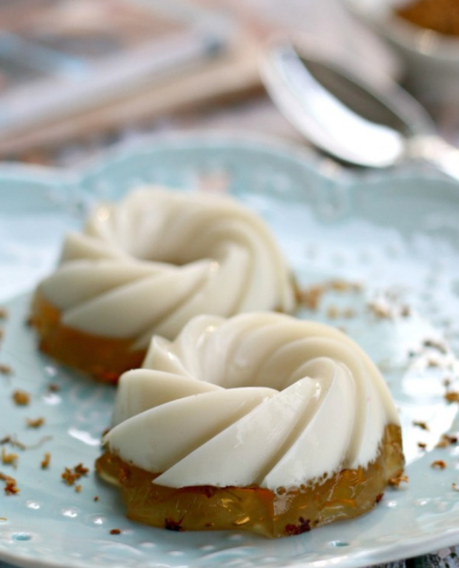 Thạch sữa dừa hoa quế có hình thức xinh đẹp như một bông hoa nhỏ. Món tráng miệng tinh tế này có phần thạch được làm với công thức chứa nhiều bột rau câu nên ăn dai cứng, sật sật rất mê!
