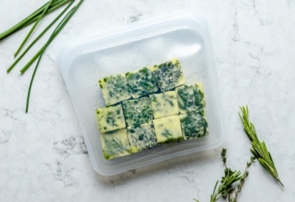 Sau đó, chuyển các viên rau gia vị đã đông lạnh sang túi zip. Khay đá silicon có thể rửa sạch để thực hiện các mẻ tiếp theo.