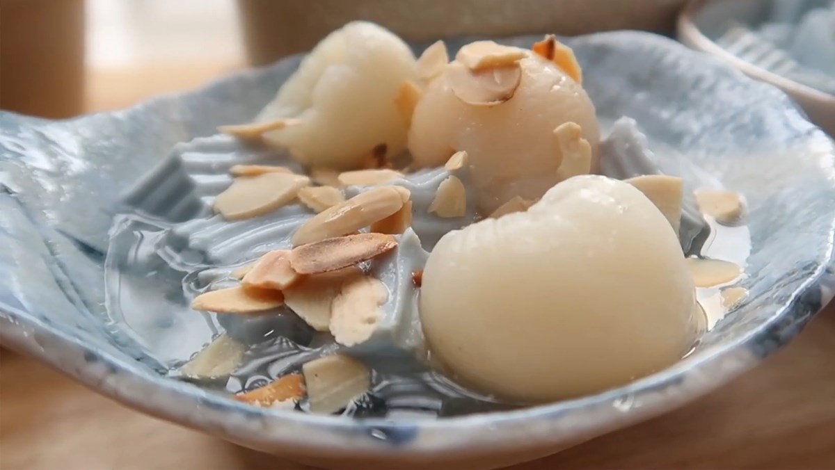 Nhưng điểm nhấn đặc biệt đó chính là phần thạch khúc bạch được làm bằng nước hoa đậu biếc nên khi ăn ta sẽ cảm nhận được hương thơm dịu nhẹ đặc trưng của hoa đậu biếc. Cho thêm hạt nhân rang thơm phức lên nữa, trộn đều là có thể thưởng thức ngay rồi!